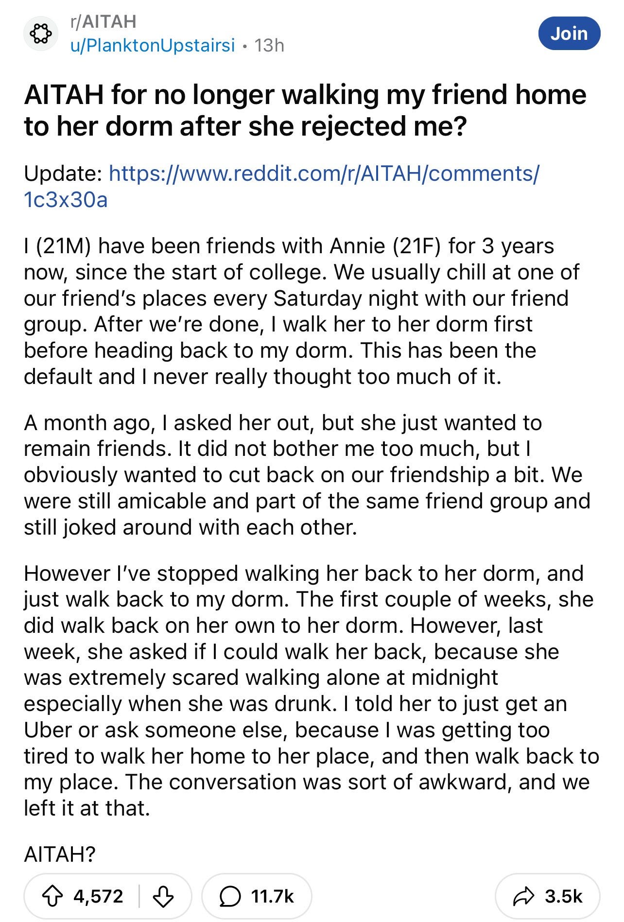 “AITAH for no longer walking my friend home to her dorm after she rejected me?”